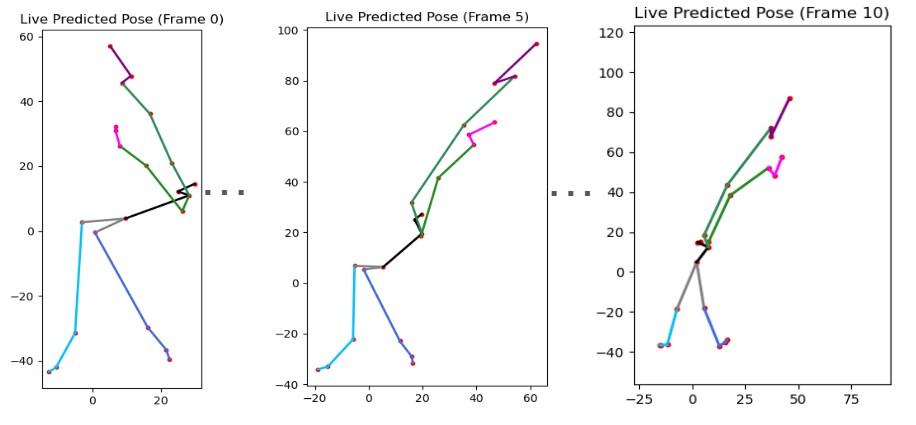 We show the predicted future joint trajectories from the siMLPe network over several frames. Each plot visualizes the progression of joint movements based on past observed poses, demonstrating the model’s ability to anticipate natural human motion with minimal latency.